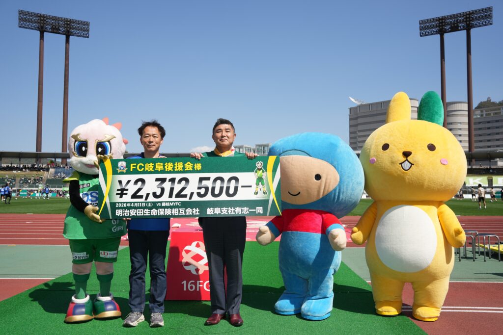 4月11日(土)藤枝MYFC戦にて『明治安田生命保険相互会社 岐阜支社有志一同 様』から多額のご支援に感謝して、試合前のピッチにて寄贈パネルの贈呈式をおこなわさせていただきました。